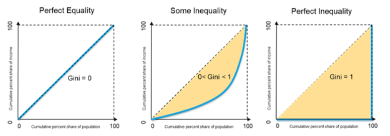 Gini coefficient is a typical measure of income inequality. The coefficient varies between 0 and 1, with 0 representing perfect equality and 1 perfect inequality.