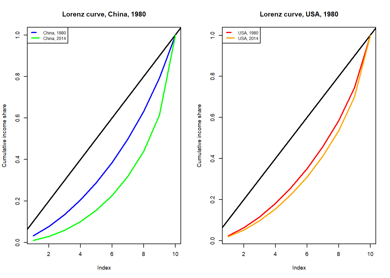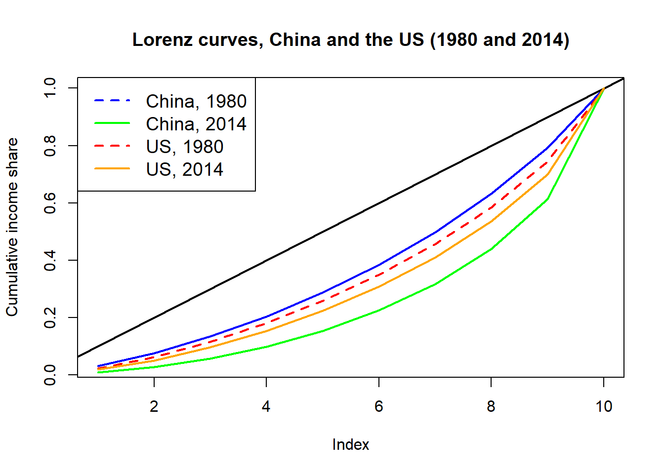 - For China - The Lorenz curve has shifted further from the equality line, indicating a rise in inequality.