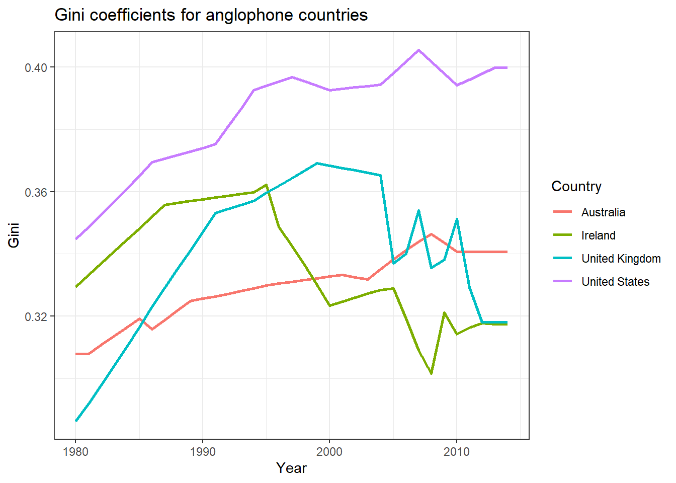 This R code extracts data for the United Kingdom, United States, Ireland, and Australia from the *decile_data* dataframe. It then employs **ggplot()** to generate a plot with Year on the x-axis and Gini coefficient on the y-axis, differentiating each country with distinct colored lines.
