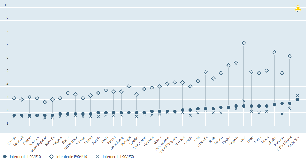 The ratio of the upper bound value of the ninth decile to the median income (P90/P50) and the ratio of the median income to the upper bound value of the first decile (P50/P10) are significant indicators.
