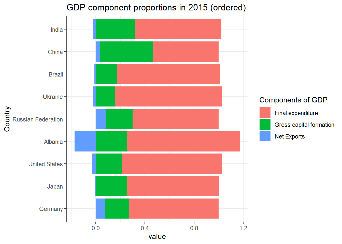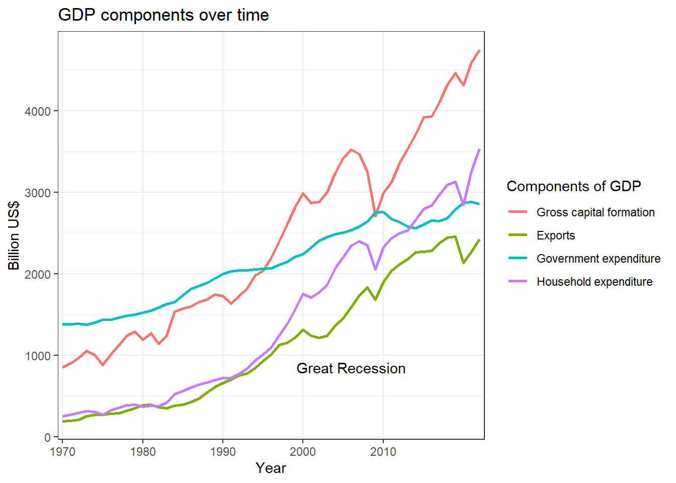 GDP = (Household Consumption Expenditure) + (General government final consumption expenditure) + ( Gross Capital Formation) + (Exports - Imports)